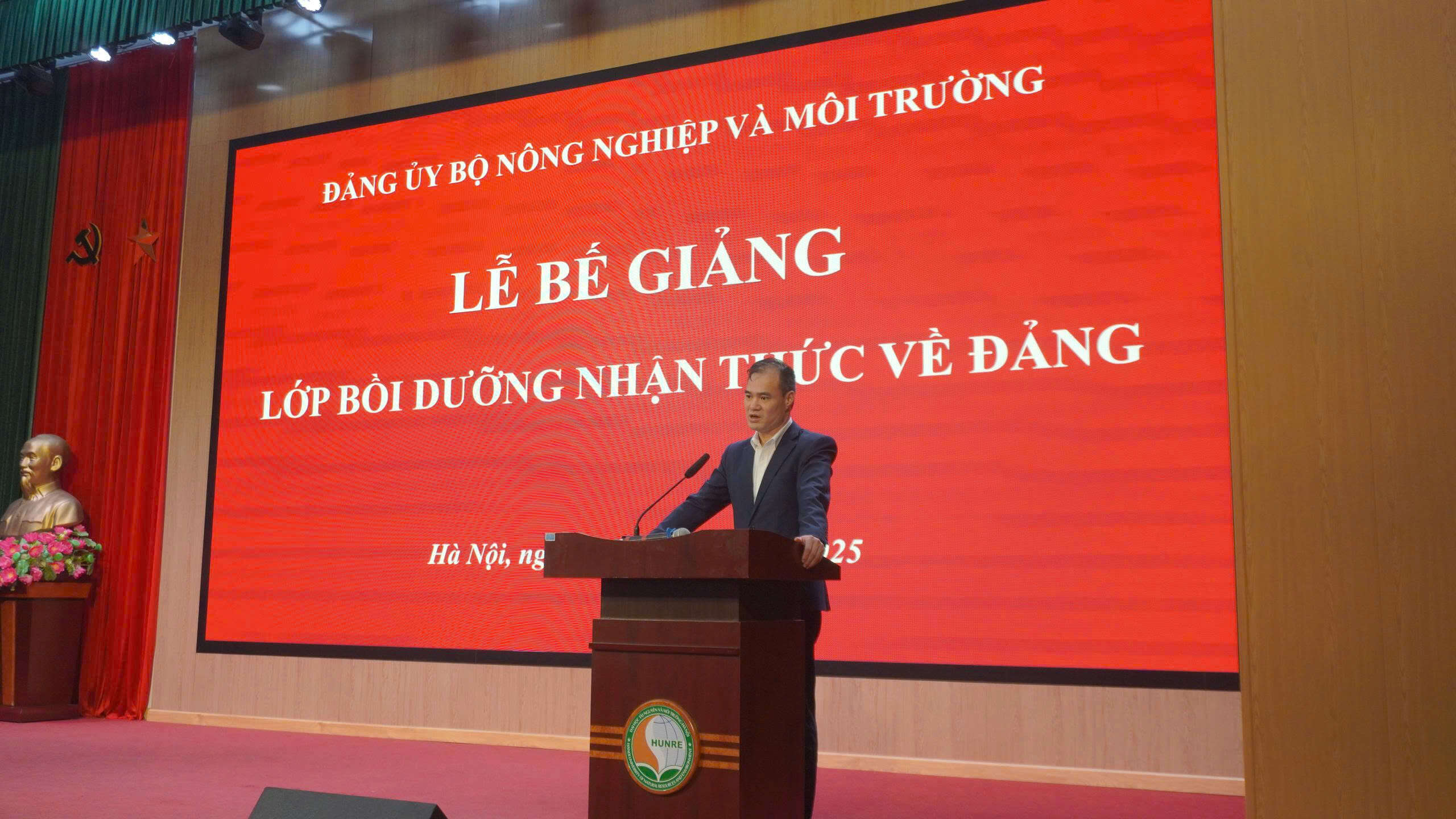 Phát biểu tại lễ bế giảng, đồng chí Phan Thành Công, Ủy viên Ban Chấp hành, Phó trưởng Ban Tuyên giáo và Dân vận Đảng ủy Bộ biểu dương tinh thần học tập nghiêm túc, ý thức rèn luyện của học viên; đồng thời nhấn mạnh ý nghĩa đặc biệt của ngày hôm nay 07/11 – kỷ niệm 108 năm Cách mạng Tháng Mười Nga (1917 - 2025), sự kiện lịch sử trọng đại mở ra thời đại mới cho nhân loại, khẳng định sức sống bền vững của lý tưởng cách mạng vô sảncon đường đi lên chủ nghĩa xã hội mà nhân dân ta đã lựa chọn. Đồng chí bày tỏ sự trân trọng đối với tinh thần phối hợp chủ động, trách nhiệm của Trường Đại học Tài nguyên và Môi trường Hà Nội trong việc chuẩn bị cơ sở vật chất, tổ chức giảng dạy và quản lý lớp học. Đồng thời nhấn mạnh, Nhà trường đã có nhiều nỗ lực trong công tác phát hiện, bồi dưỡng và giới thiệu quần chúng ưu tú cho Đảng, qua đó đóng góp tích cực vào công tác phát triển đảng viên mới của Đảng bộ Bộ Nông nghiệp và Môi trường.